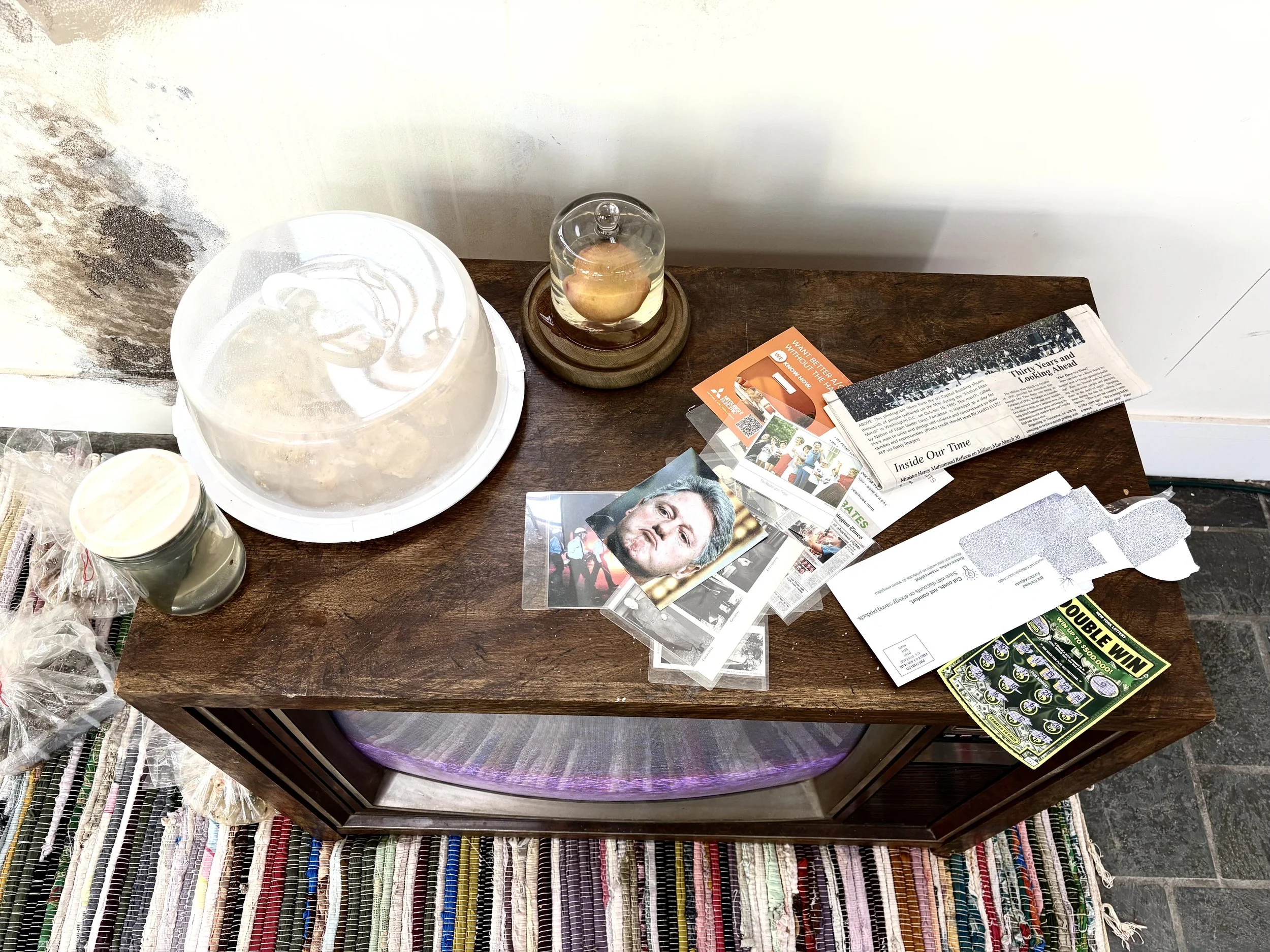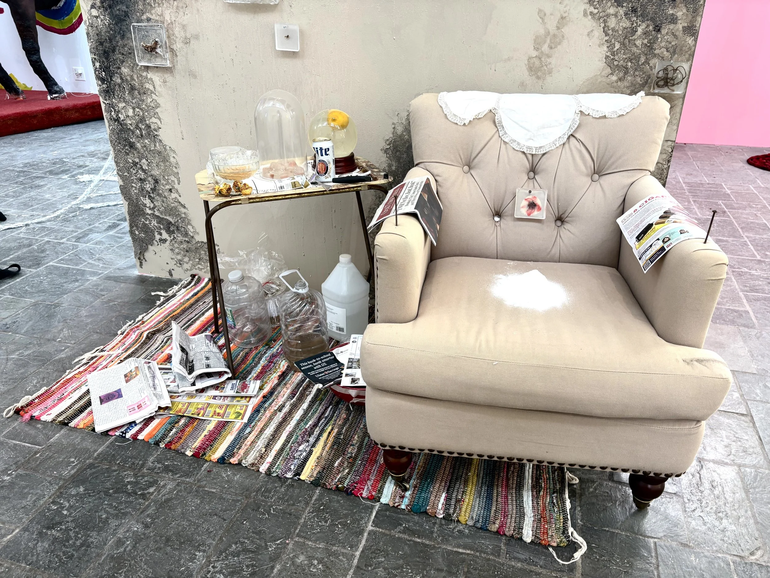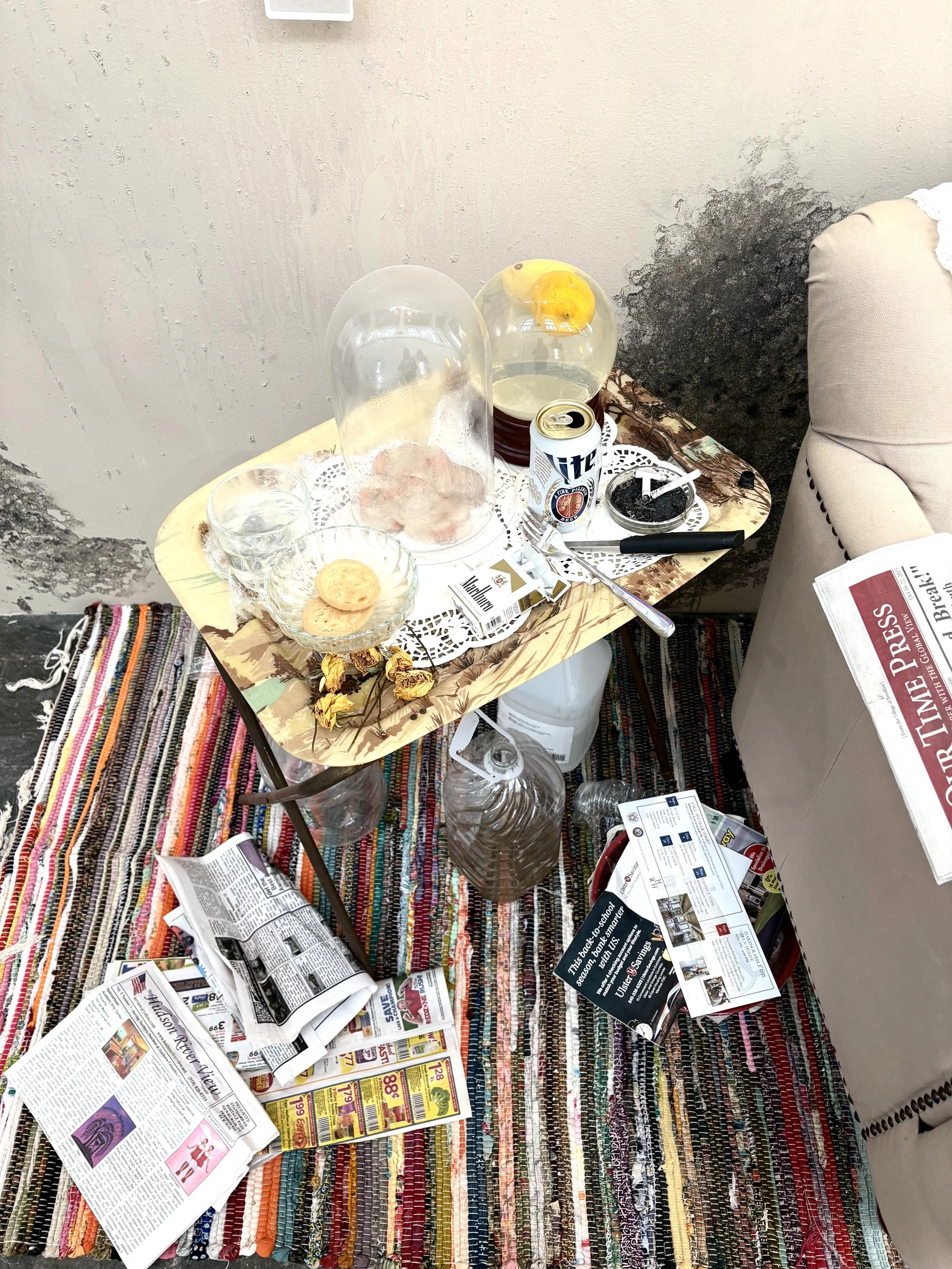 Created at Bard College, the work is a living installation (literally) of life and death, perceived from those who continue on. The usage of biodegradable materials forces viewers to consider what the living continue to take for granted, in the atmosphere of a familiar and familial space. Right away, loss is apparent in the environment. We see an empty chair, a coat (lovingly placed on a hook), old newspapers, empty beer cans, and smoked cigarettes. The visualization of who once walked in, hung up their coat, sat in the chair (with a Miller Lite and a Marlboro Gold), emerges.