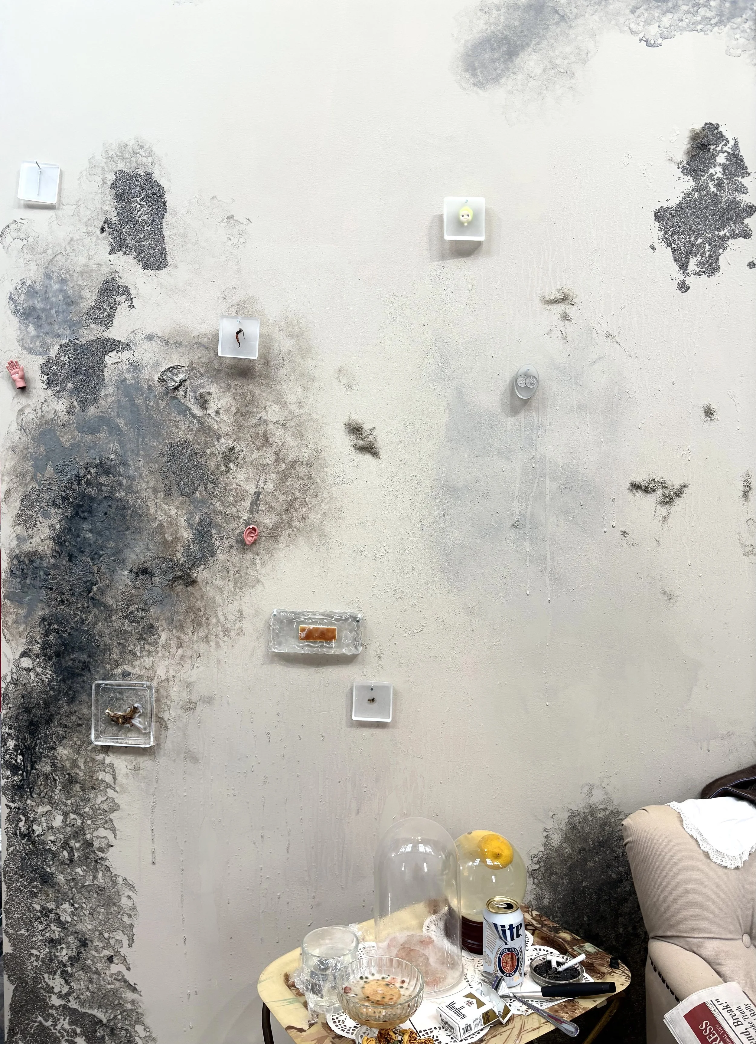 There One Day, Gone the Next, is a piece born out of healing from loss. The artist, Charlotte Tampol, delves into her own experience with mourning and reconciliation of death through creating a tangible memory. Touching upon themes of neglect, decay, nostalgia, grief, mundanity, and presence, this immersive installation explores a collective experience of change and sorrow over what once was. It is the nostalgic melancholy of cleaning out your grandparents’ house after they pass away and experiencing the familiar through a new lens. Formally, Tampol’s use of gelatin and epoxy calls to the life span of material and matter. Through time and exposure, the gelatin breaks down and begins to decompose. The temporal quality of this medium brings a sense of life into the objects. One cannot escape this cycle; however, those who are aware of it have a fighting chance at making the most of their time here. The decomposition feeds organisms and bacteria, which are the building blocks of life itself. We consume the world around us as it consumes us; in other words, we exist in an ouroboros of consumption and capitalism that eats away at those who do not acknowledge it.